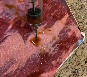 Inject the brisket with a phosphate solution made from a commercial brisket injection and beef broth, according to package directions. Some brands have a bit of an off flavor and you will just need to sort that out, I’m not going to name the ones that disappointed me and they may have improved their product since I used it. You can buy an injector (a simple syringe with a big chamber) at barbecue stores and at grocery stores that have the right attitude. Use 10-12 injection sites in each brisket.
