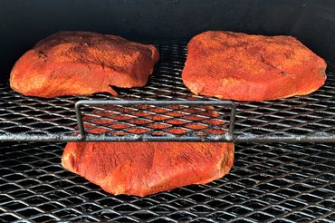 With the smoker at 250-300 degrees, place the brisket meat side up in the smoke box or on the side of the grill opposite the coals for indirect cooking. Place the probe of a digital read out thermometer into the thickest part of the brisket. Insert the probe parallel to the slicing edge and about two inches in so that you will not get holes in any competition slices. Add wood to the coals to start the smoke. Close up the smoker or grill and leave it alone. Do not disturb anything as long as the heat stays around 225-240 degrees. After 3 hours of undisturbed cooking, you can increase temp to 240-250 but don’t exceed 250. At this point, spray with apple juice or AJ+Dr. Pepper. Repeat every 30 minutes or so.
