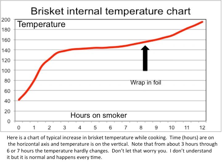 The internal temperature of the brisket will rise fairly rapidly for the first few hours but will stall at around 145 degrees. Don't worry, its still cooking and making progress but your temp may change only a few degrees for 2-4 hours (see chart below). That's OK and normal. After 5-6 hours, switch to a mop instead of the spray. Add charcoal as needed. When the internal meat temperature reaches 165 degrees, remove the brisket from the smoker and place it on a sheet of heavy duty aluminum foil. Spray or mop one more time, then wrap and seal the foil.